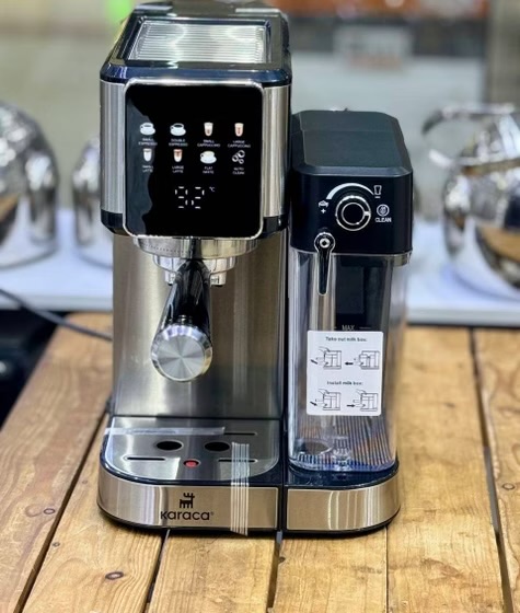 اسپرسوساز کاراجا مدل EM3208 ظرفیت ۱ لیتر امکان تهیه اسپرسو، لونگو، آمریکانو، کاپوچینو، لاته، ماکیاتو، فلت وایت، شیر گرم و آب جوش _ دارای نمایشگر دیجیتالی با قابلیت نمایش میزان فشار _ مجهز به سیستم حفاظتی در برابر حرارت بیش از حد _ قابلیت تنظیم میزان کف شیر _ قابلیت شخصی سازی قهوه